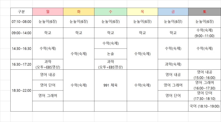 아침부터 저녁까지 일정을 시간별로 구분해주고 이것을 가지고 아이가 학습 계획을 세웠습니다.
